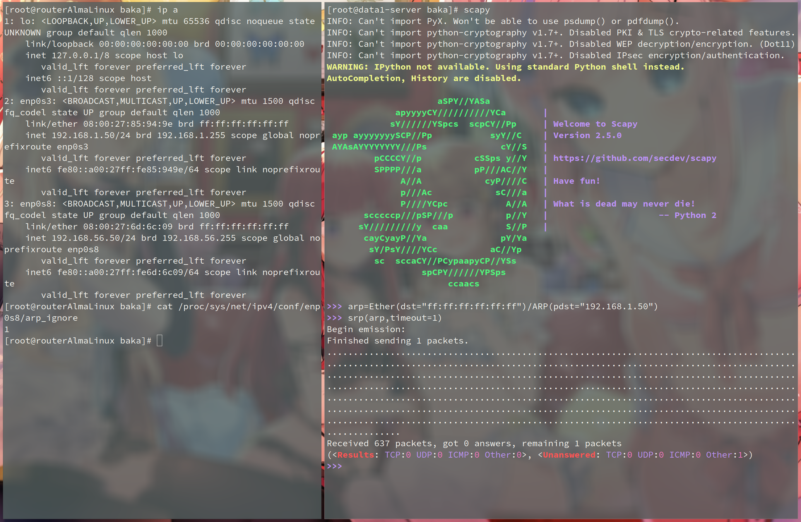 本次实验将更改AlmaLinuxRouter的arp_ignore参数,并用data1-server对AlmaLinuxRouter发起arping以验证想法